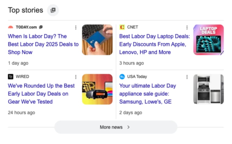 To add Shop TODAY as a preferred source, simply open up your Google Search results page directly on your computer or phone. Type in a specific phrase or topic in the search bar, hit enter and keep scrolling until you see the Top Stories module appear. Once there, you’ll notice a circle with a starred folder icon inside to the right of Top Stories. Add "TODAY.com" in the required field and check the blue box. Refresh your results and TODAY.com, along with Shop TODAY (which is part of TODAY.com), will automatically be saved as one of your preferred sources.