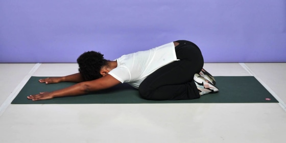 Begin with your hands and knees on the floor. Spread your knees so that your legs are apart, but keep your toes together so that your calves form a “V” shape. With your spine straight, reach your arms forward past your head so that your chest is in between your thighs. Remain in this position for 30 seconds, remembering to take deep breaths.
