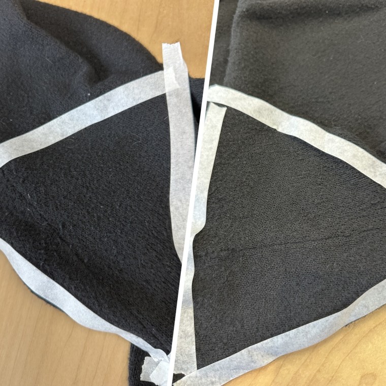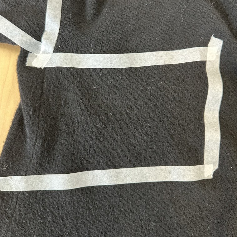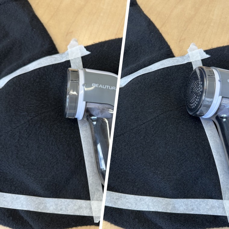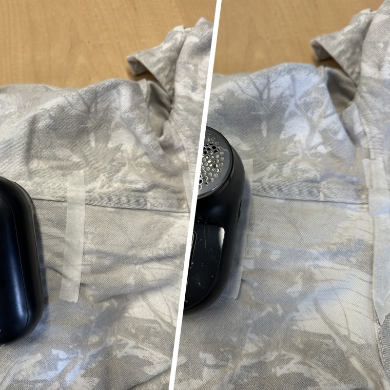 I, Annie Shigo, gathered a few items from my own closet that were pilling in different areas. I chose a pair of cotton- and denim-blend pants that had pilling around the groin, a cotton shirt that had pilling on the side panels and a polyester-blend sweater that had pilling all throughout. I then used tape to section off the areas I'd be testing a fabric shaver on.